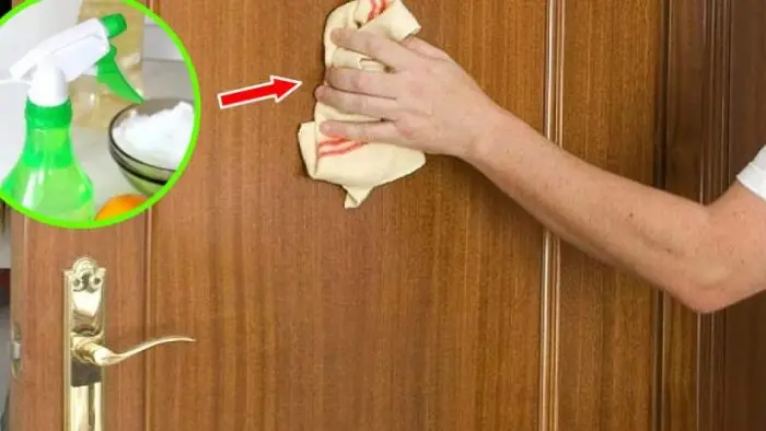 Spruzzare la soluzione direttamente sui mobili o sulle porte in legno, quindi lucidare con un panno pulito e asciutto.